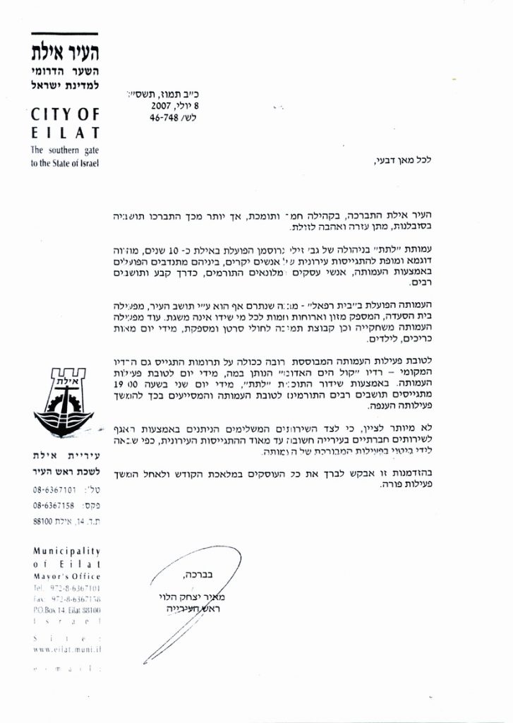 הלב של אילת 14/09/2006ביום רביעי הבא, יערך יום ההתרמה השנתי לתכנית 'לתת באילת' ברדיו 'קול הים האדום'. תוכניתה של זילי גרוסמן, מוסד ואם באילת, חוגגת עשור של נתינה.